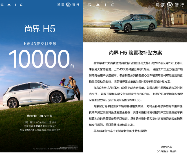 车市金九银十刚刚收官,不少新车都如偿所愿拿下不错的成绩。其中,尚界H5作为新晋品牌车型,在上市43天内实现交付量突破10000台,成为近期备受关注的市场现象。在销量快速爬升的同时,尚界汽车也公布了新一轮购车权益:12月1日前下定的用户,可享受价值43588元的限时权益与9000元跨年购置税补贴,进一步解决了用户的购车顾虑。补贴给够,将省钱进行到底尚界H5的市场表现,很大程度上得益于其“科技普惠”的