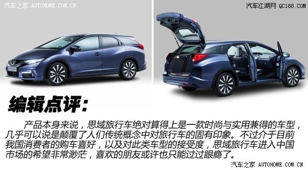 思域旅行车漂亮、前卫的外观造型让我在看到照片的伊始就有种砰然心动的感觉,再加上它同样年轻时尚的内饰设计、实用且灵活多变的车内空间,对于年轻家庭来说是一款非常有吸引力的产品。不过介于目前国内消费者对旅行车这类车型的接受度不高,因此我们觉得思域旅行车短期内进入中国市场的可能性不大,不得不说是一件比较遗憾的事情。当然,作为对应产品的补充,前不久刚上市的杰德倒也是一款值得关注的车型。它可谓是两厢轿车、旅行车以及MPV车型三者的融合,而且外观内饰造型也很有视觉冲击力,在买不到思域旅行车的情况下,杰德倒也不失为一款可供替代的车型。