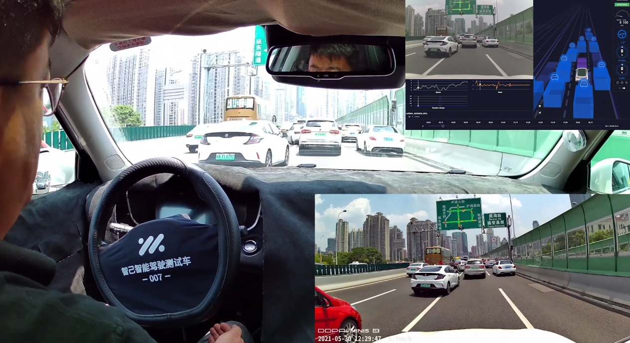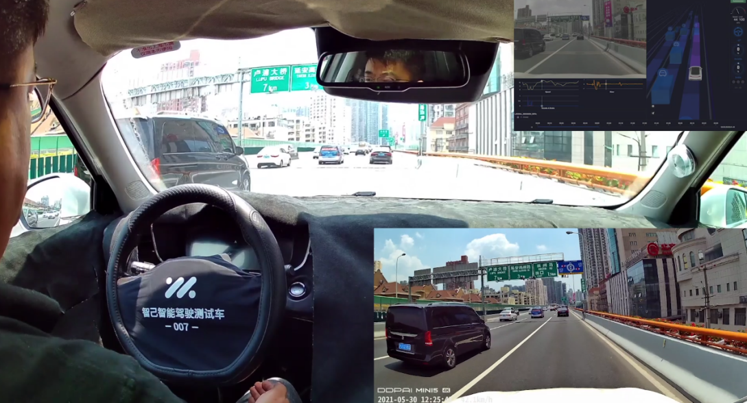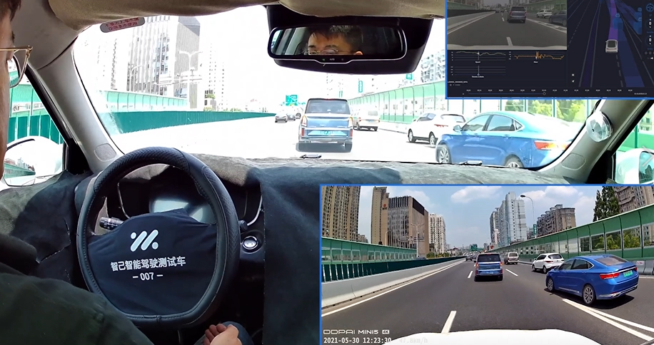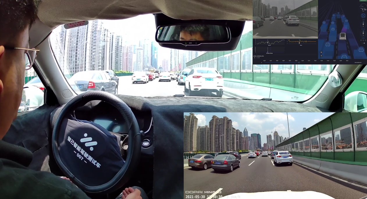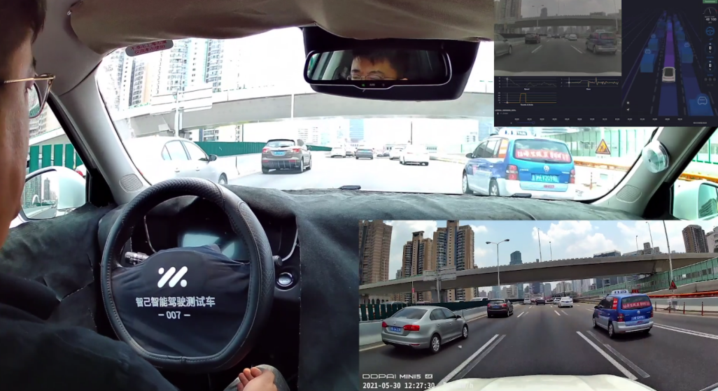 实际处理:在上匝道过程中,智己IMAD感知到有车辆超车,插队加塞进入汇流,一般情况下会进入防加塞模式,但在必要情况下会拉开距离给超车车辆留出空间。在进入汇流状态时,遇到前车变道的情况,不仅会降低速度,避让变道车辆,同时还会自动识别前方较为通畅、有更高效率的车道进行变道,实现安全、高效的汇入。