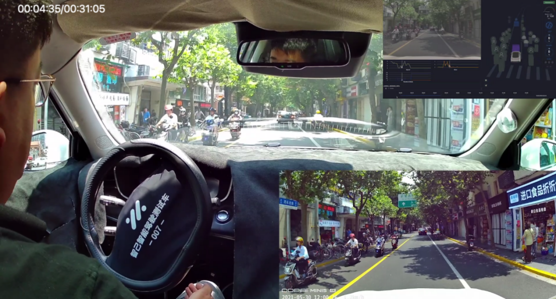 场景描述:左转进入单行道后,进入人车混流的场景:有较多同向和对向的自行车、电瓶车经过;有穿梭的外卖小哥,以及其他行人;前方还有汽车等待红绿灯。该路段处于较为拥堵的状态,且前车略微压线行驶。