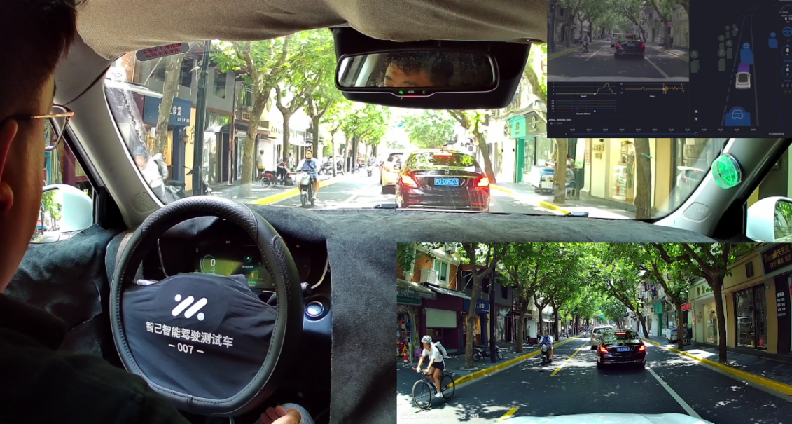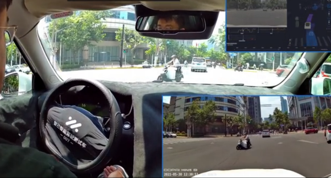 实际处理:智己IMAD在左转过程中会自动识别是否有对向车流,采取自动减速或停止让行;在面对人车混流的场景时,会自动识别左右经过的行人、非机动车辆,在有同向非机动车进入机动车道时,会自动向左偏移行驶,避让结束后恢复居中行驶。整体避让较为自然,没有骤停的情况。在前车等待红绿灯的拥堵状态下,会智能缩短跟车距离,更接近于人跟车的状态。