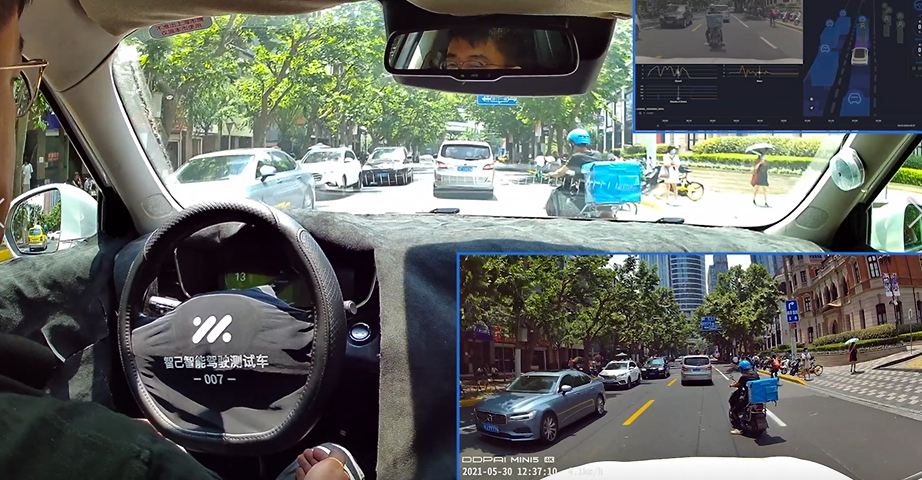 实际处理:智己IMAD在汇入狭窄道路后,自动降速行驶,在感知到有外卖小哥从右侧驶入机动车道横穿马路时,减速进行避让。
