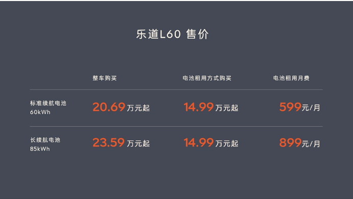 越级的配置,会是高价格吗?20.69万-23.59万元的价格区间,相较于第二代全球车Model Y 24.99-35.49万来说,从定价上就已经极具杀伤力了,更不用谈Model Y是5年前上市, 5年前的产品配置以及技术已经被快速发展的新能源产品所超越;不止于此,乐道还有一大杀手锏,基于蔚来成熟的租换电服务体系,乐道和蔚来一样可以选择BaaS方案,如果选择租电BaaS方案,价格仅需14.99万元,这么高的配置,这么低的价格,试问还有哪一款车能够做到?
