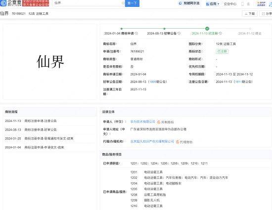 近日,我们在国家知识产权局商标局公布的信息中看到,华为又一批汽车类商标注册成功。商标详情页面显示,华为注册成功的“仙界、天界、君界”商标,均于今年1月4日申请,注册公告日期为11月14日。