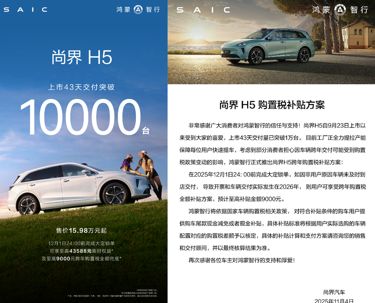 尚界H5凭借亲民价格、扎实续航、领先智能配置与综合品质保障,在较短时间内获得了市场认可。其交付破万的成绩,不仅反映了产品定位的精准,也体现出在高阶智驾逐步普及的背景下,消费者对“高价值”车型的旺盛需求。随着年末购置税补贴政策的延续,其市场表现仍具潜力。