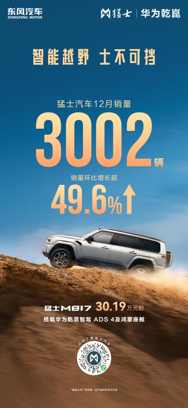 作为豪华智能越野赛道的标杆之作,猛士M817自8月上市后,迅速跻身豪华新能源越野第一阵营,并且仅用4个月便达成万台下线,创下了高端新能源越野车型量产速度的新纪录,同时在其带动下,猛士汽车自9月起销量强势实现“四连涨”。12月销量更是达到3002台,销量环比增长49.6%。
