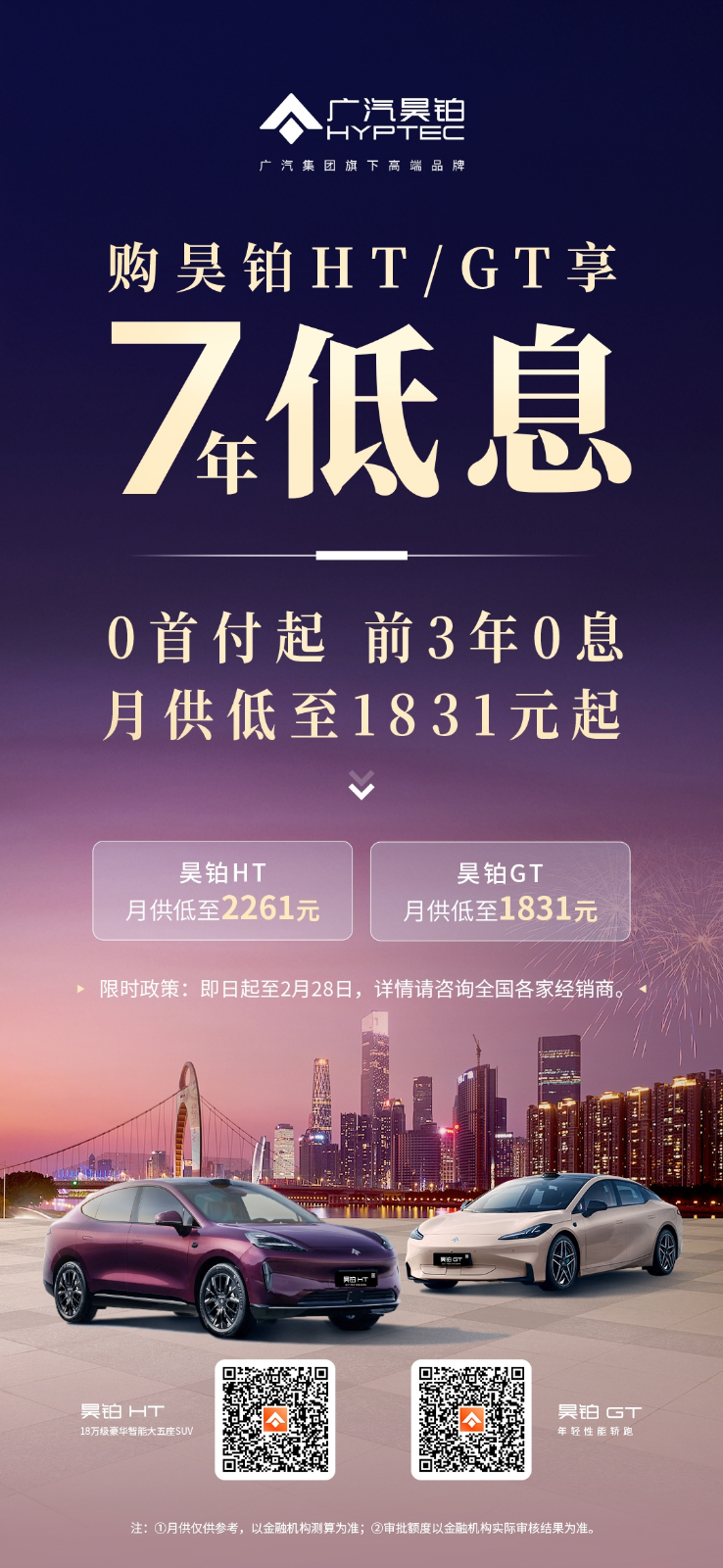 除了金融政策支持和购车补贴外,广汽昊铂还延续了“铂金服务”,向用户提供终身免费充电、终身三电质保、安心送桩到家等专属权益,并加码广汽“三担责”承诺,覆盖车辆自燃、智能泊车事故、电池衰减超限等,进一步打消用户全拥车生命周期的顾虑,让用户用车更安心。本次限时金融政策将于2月28日截止,感兴趣的朋友不妨把握时机,赶紧到店体验,详情请咨询全国各家经销商。