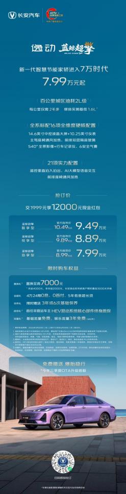 第四代逸动蓝鲸超擎发布抢订价:交 1999 元享 12000 元现金 红包,蓝鲸超擎劲享型抢订价 7.99 万元、蓝鲸超擎悦享型抢订价 8.89 万元、蓝鲸超擎智享型抢订价 9.49 万元。购全系车型用户可享五大 限时购车权益:置换礼:置换至高 7000 元(本品 4000 元,非本品 2000 元,长安逸动系列老客户限时叠加 3000 元补贴);金融礼:4 万 24 期 0 息、0 首付、5 年低息超长贷;保养礼:限时赠送 3 年或 6 年基础保养;质保礼:首任非营运车主 HEV 混动系统核心部件终 身质保;流量礼:基础流量免费,娱乐流量3年免费(6G/月)。