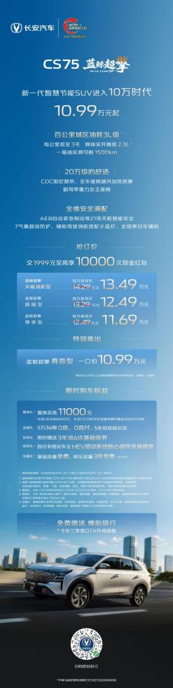第四代 CS75PLUS 蓝鲸超擎发布抢订价:交 1999 元至高享10000 元现金红包,蓝鲸超擎尊享型 11.69 万元、蓝鲸超擎旗舰型 12.49 万元、蓝鲸超擎天枢领航型 13.49 万元,并特别推出蓝鲸超擎 真香型一口价 10.99 万元(不享受现金礼、置换礼、金融礼);除蓝 鲸超擎真香型外,购其他配置车型用户可享五大限时购车权益:置换 礼:置换至高 11000 元(本品/非本品 8000 元,长安 CS75 系列车 型置换限时叠加 3000 元补贴);金融礼:5 万 36 期 0 息、0 首付、 5 年低息超长贷;保养礼:限时赠送 3 年或 6 年基础保养;质保礼:首任非营运车主 HEV 混动系统核心部件终身质保;流量礼:基础流 量免费,娱乐流量 3 年免费(6G/月)。
