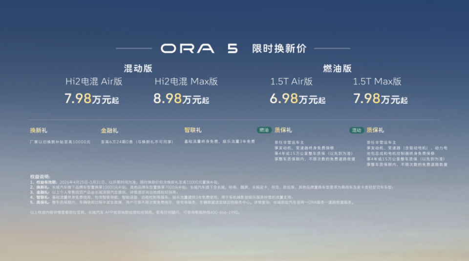 4月25日,长城欧拉在第十九届北京国际汽车展览会举办以“求实”为主题的品牌发布会。长城欧拉5混动版和长城欧拉5燃油版正式上市。其中,欧拉5混动版建议零售价8.98万元起,欧拉5燃油版建议零售价7.98万元起。现在下订更可享包含换新礼、金融礼、智联礼、质保礼在内的四重好礼,叠加上市权益后,欧拉5混动版限时换新价7.98万元起,欧拉5燃油版限时换新价6.98万元起。