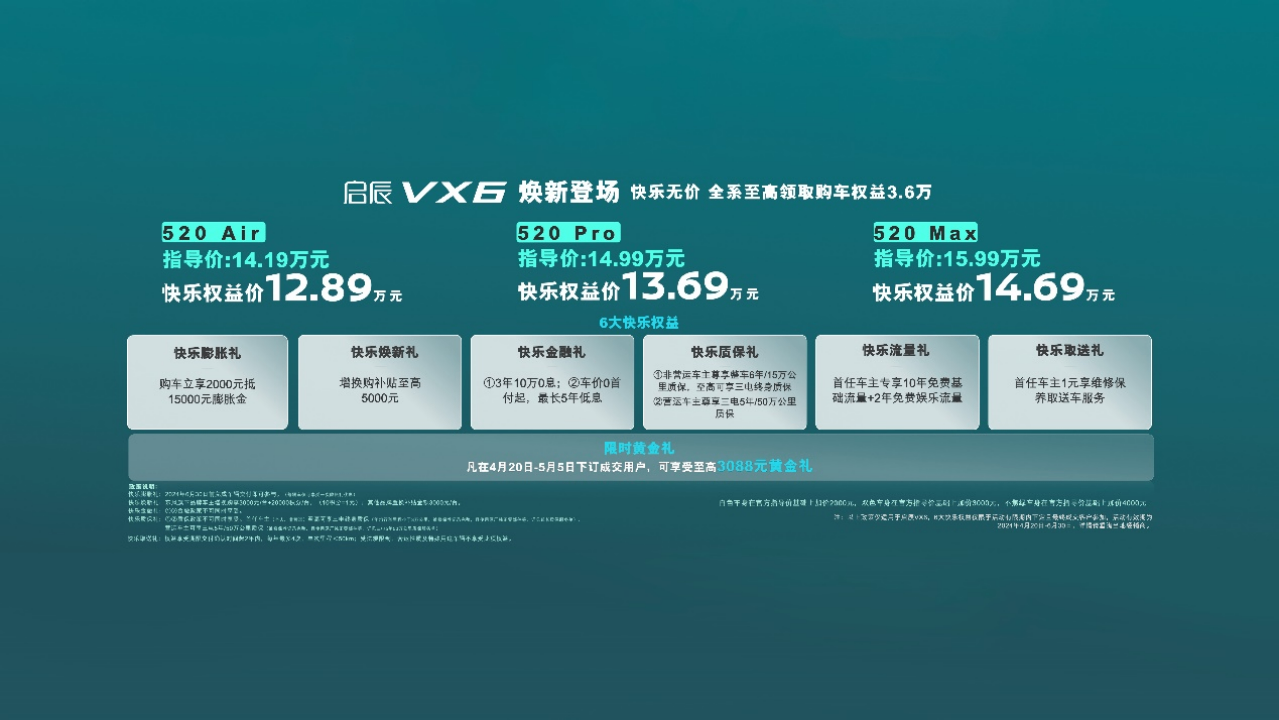 4月20日,新款启辰VX6正式上市,共推出三款车型,指导价14.19万元-15.99万元。新车不仅增加了全新车身配色,还对空间、配置以及动力进行了全面升级。启辰官方还给客户带来了6重大礼包,全系至高领取购车权益3.6万。