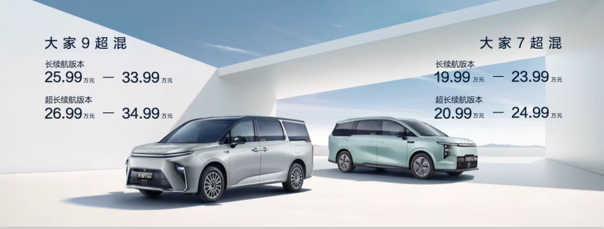 承载中高端家庭的幸福出行,得益于第三代1.5T超混专用发动机、专用DHT变速箱及高能量密度电池等尖端技术,大家9超混与大家7超混均能够在城市路况下,实现100%电感化体验,热效率高达业内领先的43%,超长续航有效解决用户的电量焦虑和续航焦虑,同时车辆具备智能化的自主选择能耗模式,用户可根据驾驶状态按需选择。作为全尺寸豪华智能MPV的大家9超混,油电混合模式下CLTC综合续航里程达到惊人的1309km,精准回应用户对于长续航的渴望。再加上越级车身尺寸、双层隔音玻璃、同级领先的“卷展云舒”三联屏和游艇级前后可开启全景天窗、欧澳五星双认证的国际化安全车身等多维硬核产品力,大家9超混将未来多人智慧出行生活一一兑现,真正从用户需求出发。